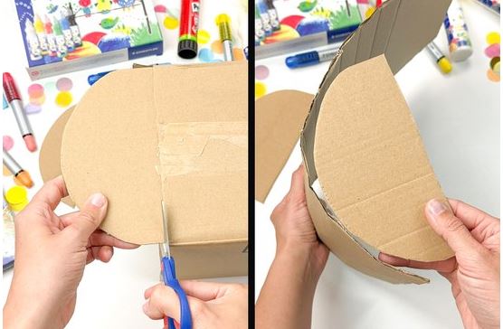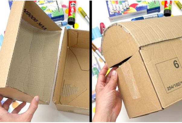 1. Kerekítsük le egy kartondoboz rövid oldalait, majd ragasszuk őket egy hosszabb kartonlap két szélére, ami később fedélként fog működni.