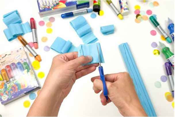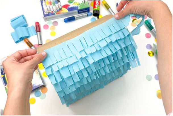 3. Vágjunk krepp-papírból 6 cm-es darabokat. Hogy meggyorsítsuk a munkát, hajtogassuk össze, és az egyik oldalán vagdossuk be. Az így kapott papírrojtokkal érhetjük el a jellegzetes pinyáta hatást.