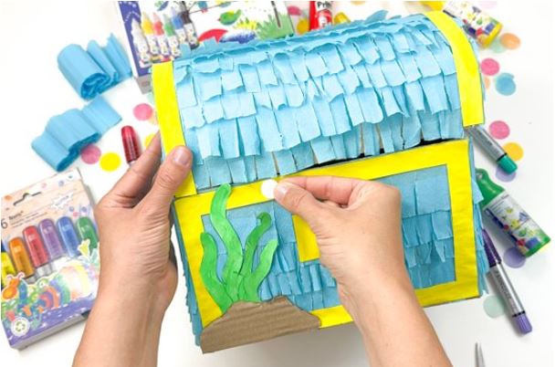 A STAEDTLER részletes útmutatójával egyszerűen elkészíthetjük ezt a különleges, kincsesláda formájú pinyátát, ami garantáltan feldobja a szülinapi partit.