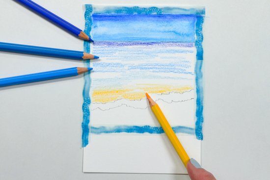 4. A permet fölött színezzük a vizet homokszínűre. Ezután váltsunk világos türkiz árnyalatra, majd a horizont felé a víz színét kék árnyalatokkal mélyítjük el. Hagyjunk vízszintes fehér foltokat, amelyek később a hullámok gerincét jelképezik majd.