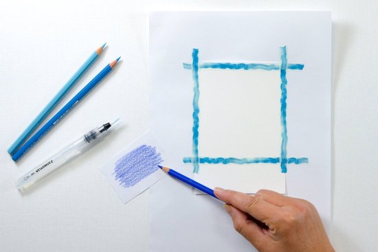 A 2H ceruza és egy vonalzó segítségével vigye át a polaroidok méreteit az akvarellpapírra. Vágja ki a papírt a külső széle mentén, és festőszalaggal készítse el a belső keretet.