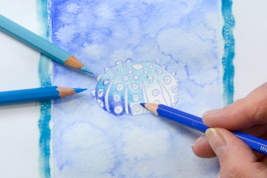 4. Most árnyékoljuk a tengeri sünt egy színátmenettel. Hagyjuk szabadon a köröket. Kezdjük a tetején világos türkizkékkel, majd középen használjunk középkéket, alatta pedig sötétkéket, és erősen nyomjuk rá a papírlapra a ceruzát.