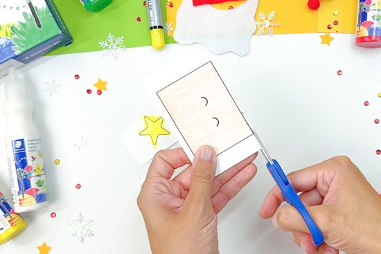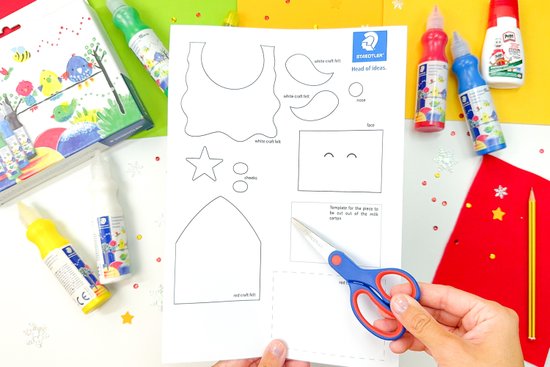 2. Színezzük ki az arcot, az arcocskákat és a csillagot a kalaphoz, majd vágjuk ki ezeket az elemeket.