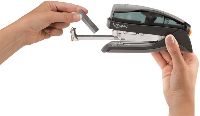 - a nyomógomb benyomásával a tűzőgép kapocsadagolója előre csúszik, így gyorsan és egyszerűen újratölthető