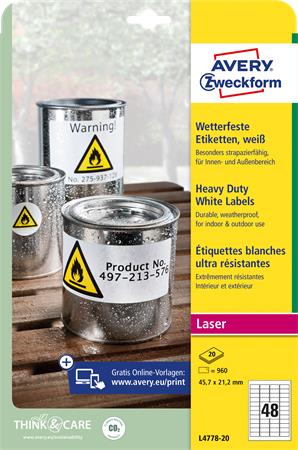 KezdőlapIrodaszerekIrodai papíráruEtikettekEtikett, 45,7x21,2 mm, poliészter, időjárásálló, AVERY ZWECKFORM, fehér, 960 etikett/csomag