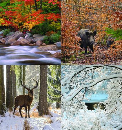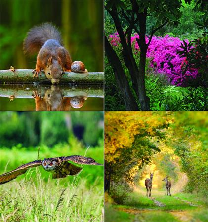 -naptár rész: magyar, angol, német nyelven, magyar  ünnepek  és névnapokkal, napkelte, napnyugta és holdállás  feltüntetésével