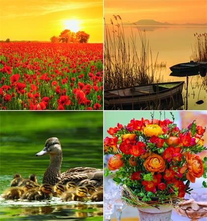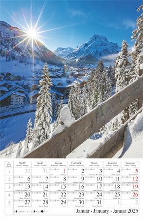 -naptár rész: magyar, angol, német nyelven, magyar ünnepek és névnapokkal, napkelte, napnyugta és holdállás feltüntetésével