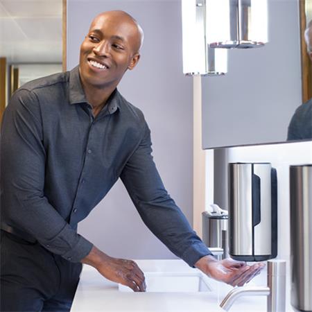 Modern, letisztult felületű és vonalvezetésű termék, amely minden mosdóban megállja a helyét. Mély benyomást tesz, és hangsúlyozza a létesítmény magas színvonalát. Mutatós, rozsdamentes acél bevonata taszítja az ujjlenyomatokat, így mindig ragyogóan szép és tiszta marad. A szenzoros, érintésmentes adagolással csökken a keresztfertőzés kockázata. Elősegíti a megfelelő szintű higiénia biztosítását: gyárilag zárt rendszerű flakon új pumpával minden utántöltéshez, így csökken a fertőzés kockázata, és maximális higiénia biztosítható a gyártósortól a felhasználókig.