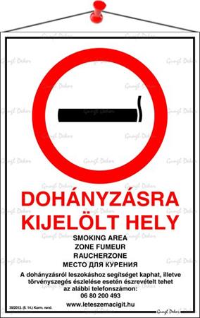 Információs tábla, 21x31 cm, többnyelvű, "Dohányzásra kijelölt hely"